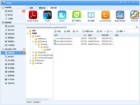 A:本地图书,通过连接电脑,将ApabiReader“文档”路径下的图书拷贝出来即可; 如果是从网上下载的分两种情况: 1)中华数字书苑借阅的图书,需要重新借阅(之前借阅的需要归还)。 2)书仓或其他第三方OPDS书店借阅的图书,使用iTools等第三方苹果助手工具访问存储路径,将下载的文件导出即可; 使用iTools等工具,需要先安装iTunes; 如下图,展示的是书仓下载图书的存储路径。 /Library/Caches/OnlineShop/Shucang/Books/EPUB