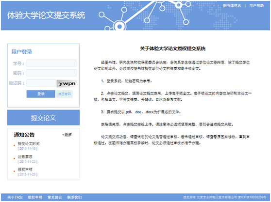 3、 授權模塊:取消了后臺的授權功能模塊,提前至學生提交論文環(huán)節(jié)。當學生第一次填寫論文信息時,系統(tǒng)會詢問學生是否將論文授權給學校保留及使用等相關權限。
