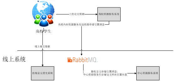 為了提高對高校使用論文提交系統(tǒng)的支持及快速響應,論文提交系統(tǒng)在線部署,高校對論文的提交、學校信息、學生信息等的管理使用線上服務,可以做到有問題及時響應。同時為了滿足高校對論文安全性的要求,本系統(tǒng)中將資源存儲從線上服務獨立出來形成了資源服務系統(tǒng),部署在高校。學生上傳的論文資源直接存儲在高校部署的資源服務系統(tǒng)中,從而達到在線提供優(yōu)質服務,線下提供資源管理服務提升論文安全性。